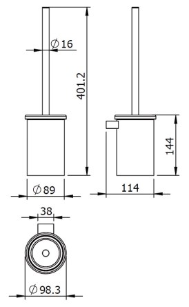 průměr 98,3 mmhloubka 114 mmcelková výška 401,2 mmvýška nádobky 144 mmprůměr rukojeti 16 mmmateriál vnitřní nádobky matné sklopovrchová úprava držáku a rukojeti kartáče chrominstalace přivrtáním na...