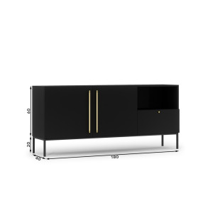 Dotaz na produkt Na splátky ještě dnesVelká komoda Lanzzi s jednou prostornou zásuvkou má čistou siluetu a neutrální, masivní povrchovou úpravu, která se hodí téměř k jakékoli barevné paletě. Zásuvka se otevírá hladce a je téměř neslyšná díky funkci tichého zavírání. Kromě toho má komoda dvě velké police, které jsou skryté za dvojicí uzamykatelných dvířek. Třetí police není zakrytá, což umožňuje vystavit například fotografie nebo svíčky. Komoda Lanzzi, široká téměř dva metry, vám umožní skrýt velké množství náhradního ložního prádla, košil, kalhot a dalších nezbytností ze šatníku. Matné barvy nábytku byly vytvořeny v následujících konfiguracích: matná černá v kombinaci s dubovým dřevem a pouze matná černá. To vám dává možnost vybrat si z oblíbené černé barvy a dřeva spojeného s přírodou. Doplněk k černé variantě tvoří zlaté úchytky. Druhá verze se otevírá pomocí pantů „push to open“, na které stačí jen lehce zatlačit, abyste mohli použít police nebo zásuvky v komodě Lanzzi. Černé kovové nohy o délce 20 cm dodávají nábytku pocit stability a zároveň jsou zajímavým doplňkem. K dispozici ve dvou barevných provedeních. Výška: 80 cm Hloubka: 40 cm Šířka: 180 cm Hmotnost: 51 kg Plastová konfigurace: černá matná + řemeslný dub / černá matná + černá matná Barva rámu: černá Materiál: MDF deska Design nohou: kov Výška nohou: 20 cm Počet zásuvek: 1 Počet dvířek: 2 Počet zavřených polic: 2 Počet otevřených polic: 1 Látky: Černá podložka, Černá podložka Šířka: 180 Výška: 80 Hloubka: 40 Styl: Moderní Základní barva: Černá Počet balení: 1 Celková hmotnost: 50 Požadovaná montáž pro dospělé: Ano Úroveň montáže: Částečně smontováno Orientace: Ne platí