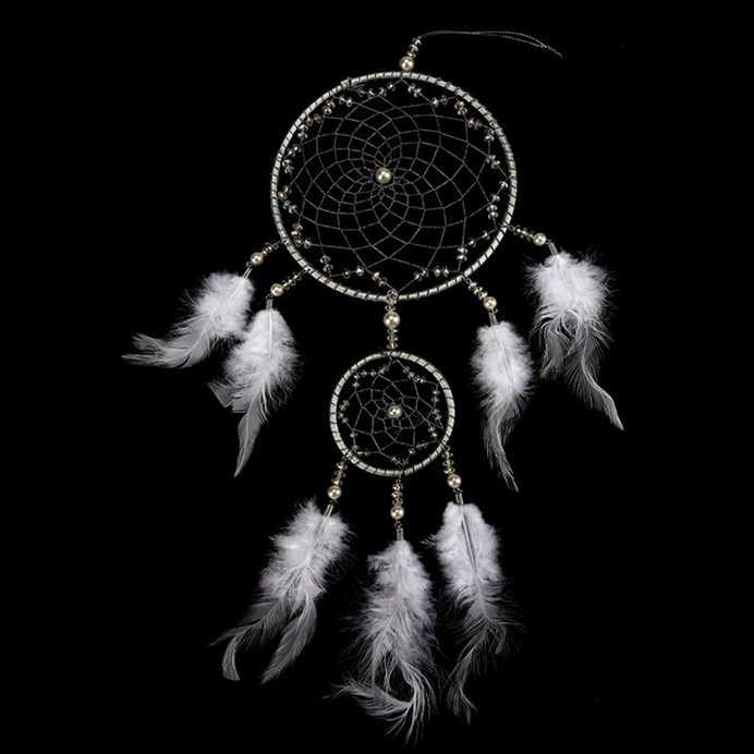 Dotaz na produktTato dekorace vyrobená z kovu, drátků a bílého peří je krásným příkladem lapače snů. Lapač snů je tradiční ozdobný předmět vycházející z kultur původních obyvatel Ameriky. Jeho posláním je chytat sny a vize, zatímco se zároveň snažit zabránit nočním můrám a negativním energiím. Tento lapač snů má elegantní design, který zahrnuje spojené dvě středové kruhové části ozdobené zespodu jemnými peříčky. Může být umístěn kdekoliv, ideálně v interiéru, jako je třeba váš obývací pokoj, ložnice nebo chodba. Jeho hlavním úkolem je zejména přinášet krásu, harmonii a pozitivní energii do vašeho prostoru.