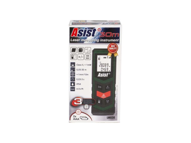 Dotaz na produktPotřebujete měřící přístroj na rychlé a přesné měření délky, objemu nebo plochy? Laserový měřič ASIST LM040-1 toho zvládne mnohem víc! Jedná se o dálkoměr, který k měření využívá laserové technologie s laserem druhé třídy o výkonu do 1 mW (635 nm). Tato technologie zabezpečuje měření v přesnosti +/- 1 milimetr na 10 metrů.. Přičemž rozsah měření se pohybuje od 50 milimetrů do 30 metrů. Má mnoho pokročilých funkcí, do kterých patří měření plochy, objemu. Napájí jej dvě AAA baterie (součástí balení). Navíc je odolný proti prachu i stříkající vodě.