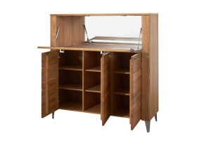 Komoda je třídveřová. V každé části se nacházejí dvě police. Ve vrchní části jsou výklopná prosklená dvířka. Uvnitř je úložný prostor s designovým zrcadlem. LED osvětlení není v ceně. Lze si jej dokoupit.