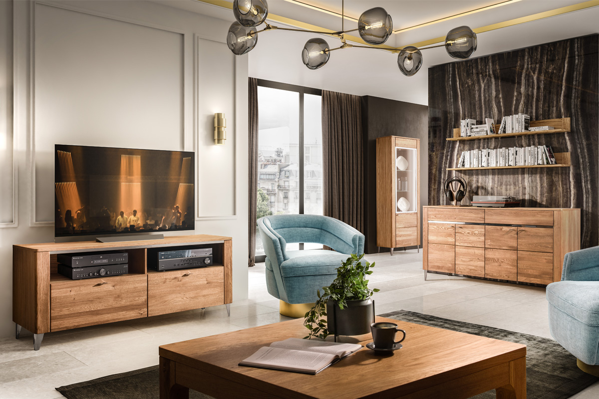 Korpus vitríny je vyroben z přírodní dýhy. Přední část je vyrobena z masivu dubového dřeva. Úchyty jsou pochromované, ve stříbrné barvě. Barevné provedení: dub medový. Disponuje vysokými elegantními nožičkami.