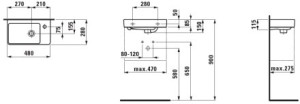šířka 48 cmhloubka 28 cmvýška 15 cmmateriál sanitární keramikabarva bílápovrchová úprava LCC (Laufen Clean Coat povrchová úprava glazury)1 otvor pro baterii vpravos viditelným přepademumístění...