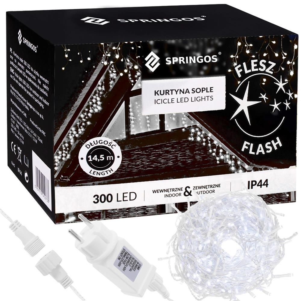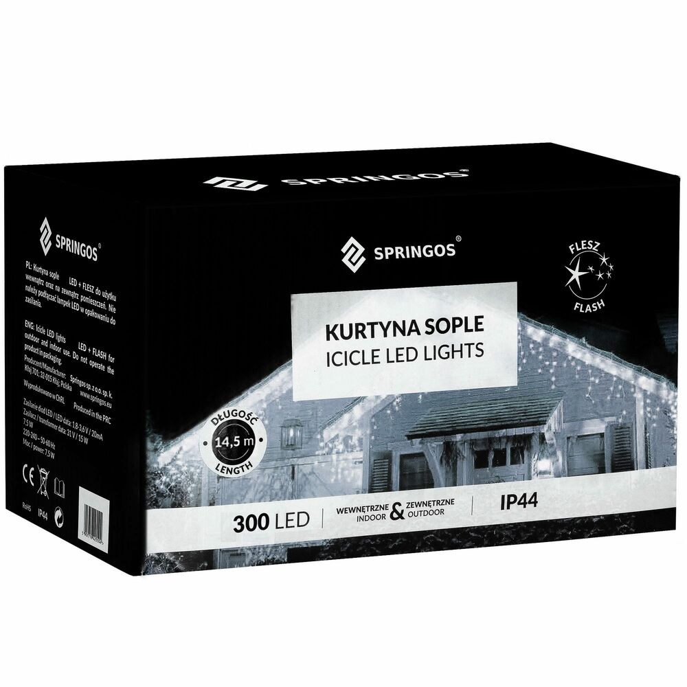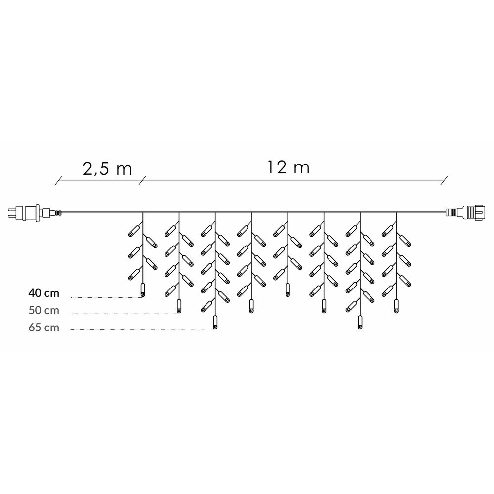 Světelný řetěz se záblesky a různou výškou volně visících krápníků. Časovač, adaptér na bezpečné napětí, ultra úsporné led diody. Vnitřní i venkovní použití, voděodolné provedení, krytí IP44. Délka světelné části 12 m, napájecí kabel 2,5 m. Barva studená bílá + záblesky studená bílá, 300 led.