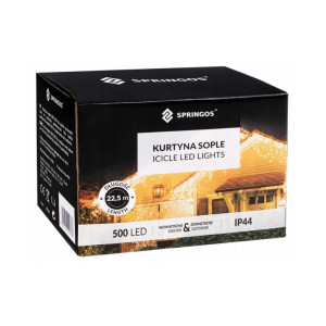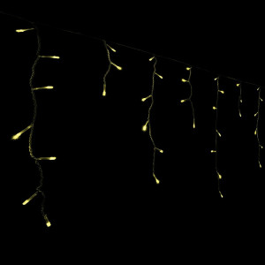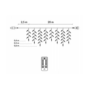 Světelný řetěz s různou výškou volně visících krápníků. Programátor, 8 světelných funkcí, dálkový ovladač, adaptér na bezpečné napětí. Ultra úsporné led diody, vnitřní i venkovní použití, voděodolné provedení, krytí IP44. Délka světelné části 20 m, napájecí kabel 2,5 m. Barva teplá bílá, 500 led.