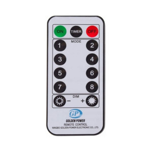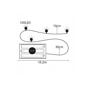Dotaz na produktUltratenký světelný řetěz s 8 světelnými funkcemi a dálkovým ovládáním. Napájení na baterie. Vnitřní i venkovní použití, krytí IP44. Délka světelné části 9,9 m, napájecí kabel 30 cm. Barva světla studená bílá, 100 LED, napájení 3x AA baterie.