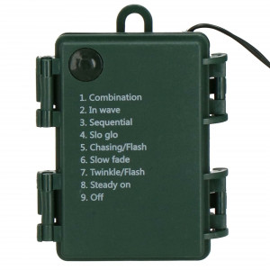 LED světelný řetěz s 8 světelnými funkcemi. Napájením na baterie, úsporné mikro diody, vnitřní i venkovní použití. Voděodolné provedení, krytí IP44. Délka světelné části 5 m, napájecí kabel 30 cm. Barva teplá bílá, 50 led, napájení 3x AA baterie.