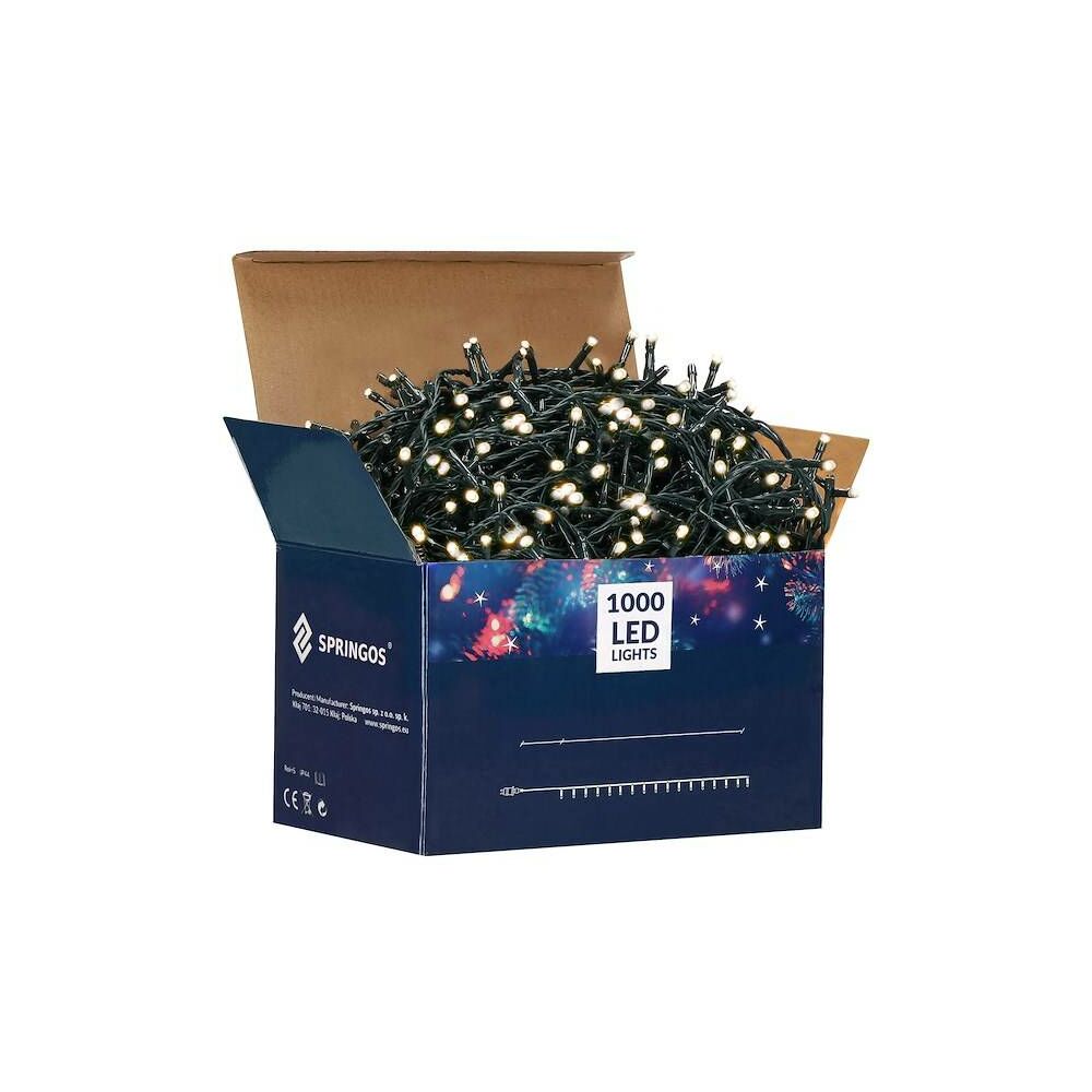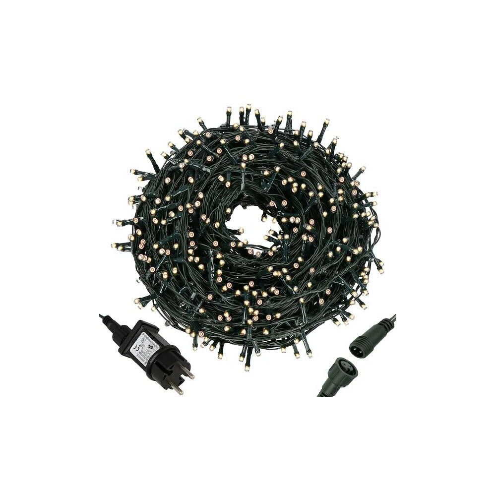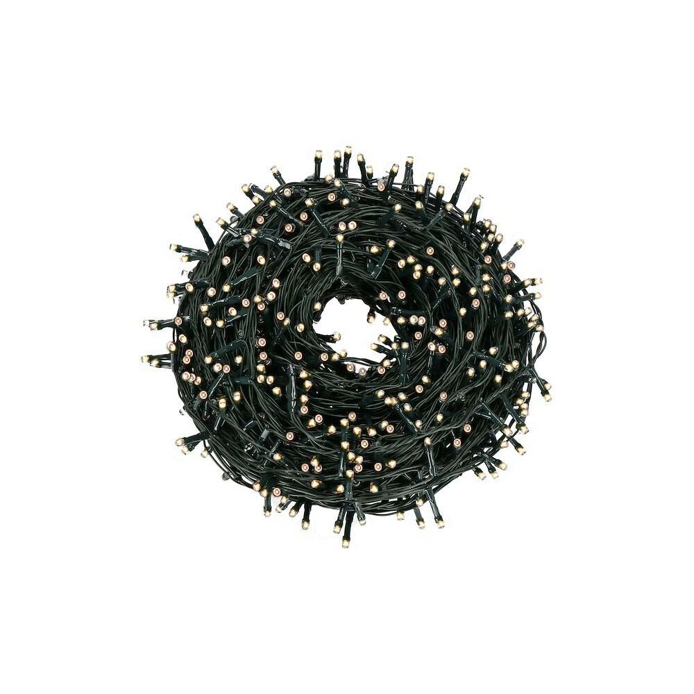 LED světelný řetěz s programátorem, 8 světelnými funkcemi a adaptérem na bezpečné napětí. Ultra úsporné led diody, vnitřní i venkovní použití, voděodolné provedení, krytí IP44. Délka světelné části 50 m, napájecí kabel 2,5 m. Barva teplá bílá, 1000 led.