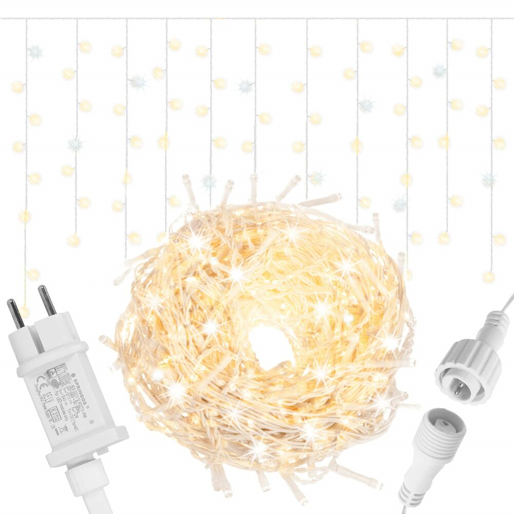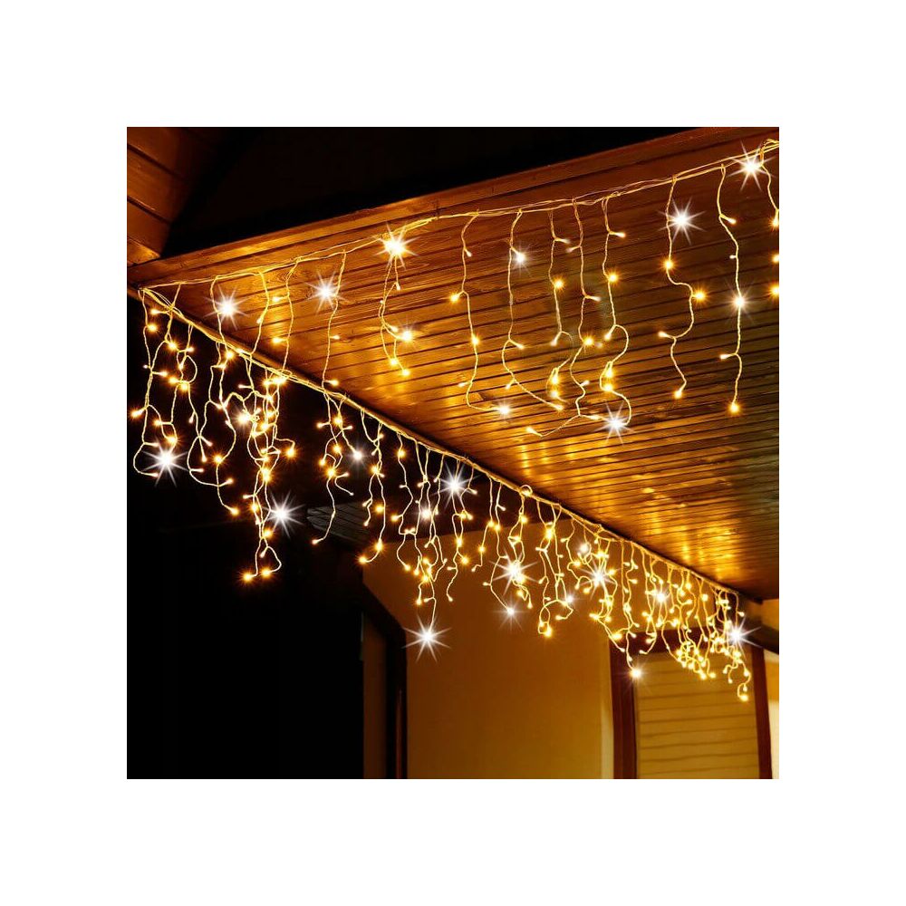 Světelný řetěz se záblesky a různou výškou volně visících krápníků. Časovač, adaptér na bezpečné napětí, ultra úsporné led diody. Vnitřní i venkovní použití, voděodolné provedení, krytí IP44. Délka světelné části 21,5 m, napájecí kabel 2,5 m. Barva teplá bílá + záblesky studená bílá, 500 led.