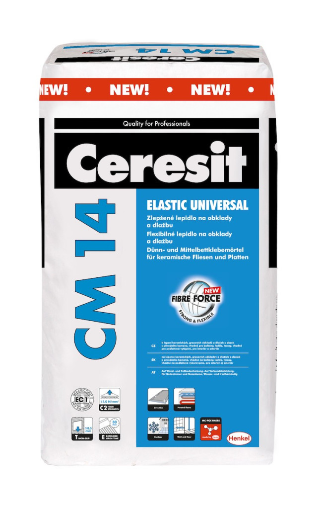 Zlepšené lepidlo Ceresit CM 14 Universal, vyztužené vlákny, je vhodné k lepení nenasákavé (gresové) a keramické dlažby, cementových desek a obkladů z umělého i přírodního kamene, který není náchylný k probarvení. Lze použít pro oblasti zatížené vlhkostí a pro podlahové vytápění. Je doporučeno rovněž pro podlahy se zvýšeným funkčním zatížením jako například v nákupních centrech či na schodištích, stejně tak je vhodné pro balkony a terasy. Lepidlo CM 14 Universal je možné použít na sádrovláknité desky a sádrokarton, anhydritové potěry, sádrové a betonové podklady a hydroizolační těsnicí hmoty Ceresit CL 50 a CL 51.