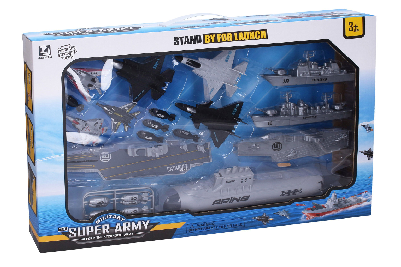 Dotaz na produktLetadlová loď s katapultem 25 cm set s ponorkou. Obsah balení - letadlová loď na setrvačník s katapultem na stíhačky 25 cm, ponorka s vystřelováním torpéd 28 cm na setrvačník, letadlová loď 18 cm, bitevní loď 16 cm, bitevní křižník 14 cm, 3x stíhačka volná kola 12 cm, 3x stíhačka katapultovací 7 cm, 12x torpédo do ponorky. Katapult - vložte stíhačku do pružiny v přední části letadlové lodě, vystřelení tlačítkem na věži. Torpédo - odklopte dvířka v horní části ponorky - vložte torpédo (max 3), sejměte přední krytku ponorky, natažením a puštěním ocasního kormidla ponorky vystřelíte torpédo. Obrázkový návod na obalu.