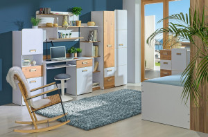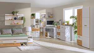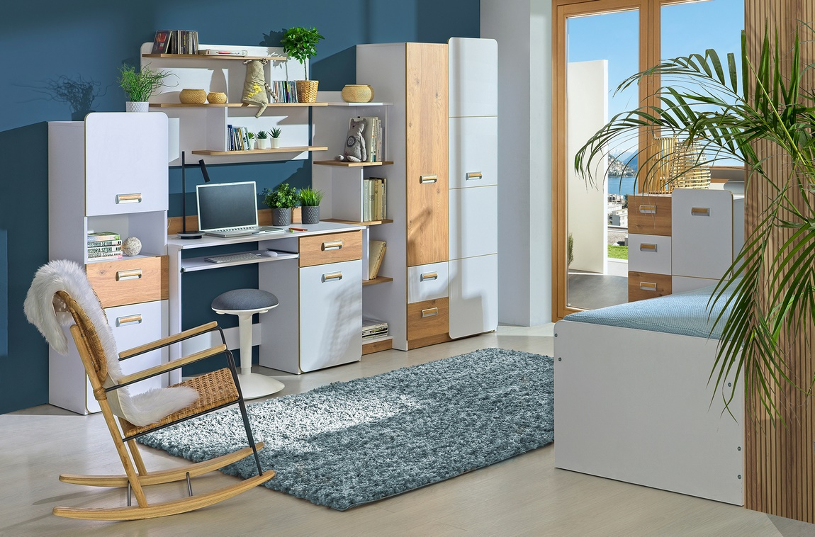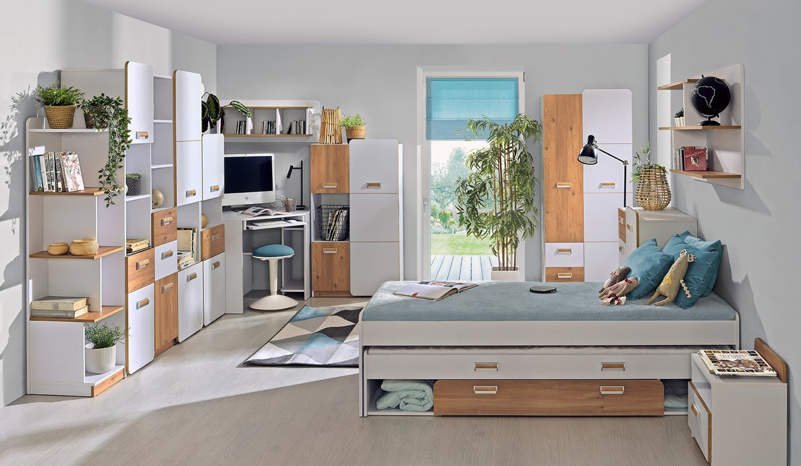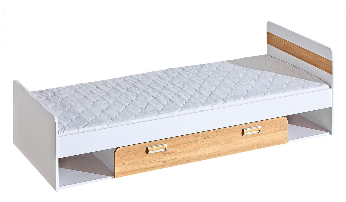 Postel s úložným prostorem. Celá řada se vyznačuje zaoblenými tvary. Úchyty jsou vyrobeny z plastu. Barevné provedení je bílá briliant, přední dvířka mají barevnou dekoraci - dub nash. Dekorace je vytvořena z ABS pásky z PVC výrazné barvy. Postel obsahuje lamelový rošt, matraci je třeba doobjednat - 195 x 80 cm. Zásuvka je na kolečkách a její rozměry - 110 x 76 cm. Nábytek je vyrobený z kvalitní laminátové desky. Za zmínku stojí i cenová výhodnost nábytku. Sestava se skládá z 16 prvků a tento široký výběr vám zaručí si sestavit nábytek podle svých představ. Dodáváme v demontovaném stavu.