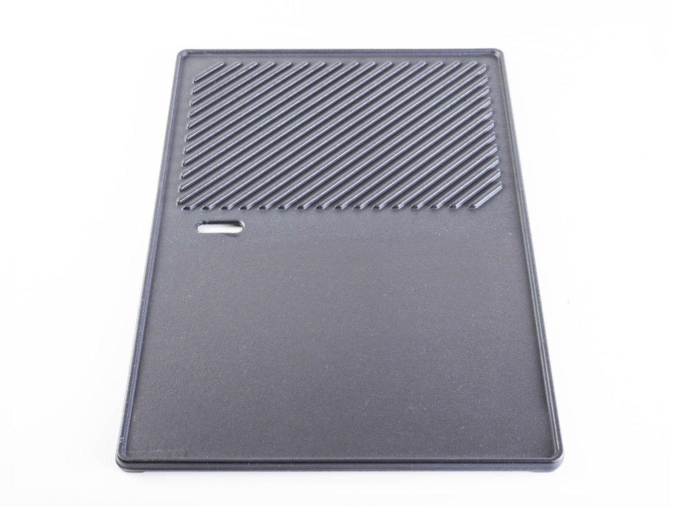 Litina patří mezi nejodolnější materiály, které se pro grilování používají. Je vysoce odolná proti vysokým teplotám a poškrábání. Na každé polovině litinového plátu máte k dispozici jiný druh povrchu. Jedna polovina je hladká a využijete ji především pro grilování nakrájené zeleniny, vajíček a sýrů. Druhá polovina s vroubky je určená pro správné grilování steaků, větších kusů zeleniny a ryb.
