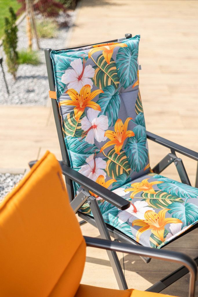 Polstr s vysokou opěrkou řady LIVING je v provedení s obšitým lemem, prošitý kroužkově 4x v opěradle. Uchycení je pomocí posuvné spony. Díky sponě si můžete nastavit velikost dle rozměru a druhu židle, spona je pevná a nevytahuje se. Upevnění sedáku je pomocí dvou tkaniček v ohybu polstru. Síla polstru je optimální pro všechny druhy židlí. Provedení je vhodné i do náročných podmínek kaváren, zahrádek a restaurací. Potah je nesnímatelný. Vyrobeno v České republice.