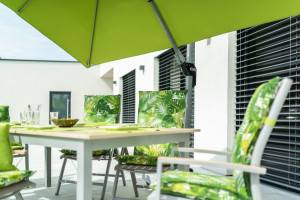 Polstr s nízkou opěrkou na zahradní nábytek řady LIVING je v provedení s obšitým lemem, prošitý kroužkově 2x v opěradle. Uchycení je pomocí posuvné spony. Díky sponě si můžete nastavit velikost dle rozměru a druhu židle, spona je pevná a nevytahuje se. Upevnění sedáku je pomocí dvou tkaniček v ohybu polstru. Síla polstru je optimální pro všechny druhy židlí. Provedení je vhodné i do náročných podmínek kaváren, zahrádek a restaurací. Potah je nesnímatelný.Vyrobeno v České republice