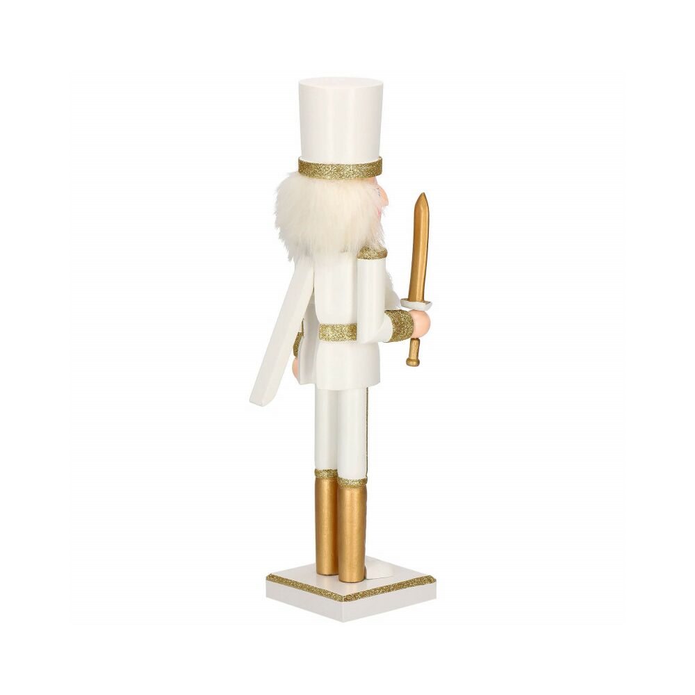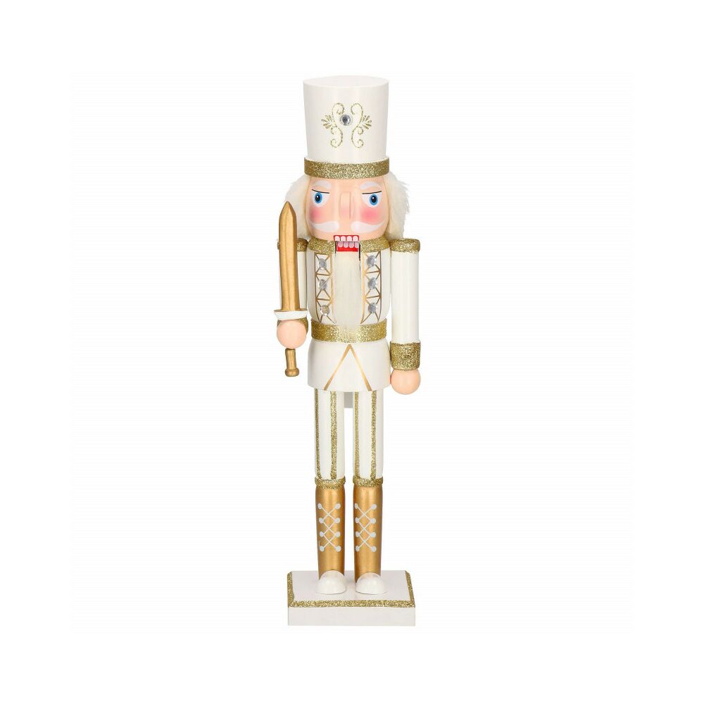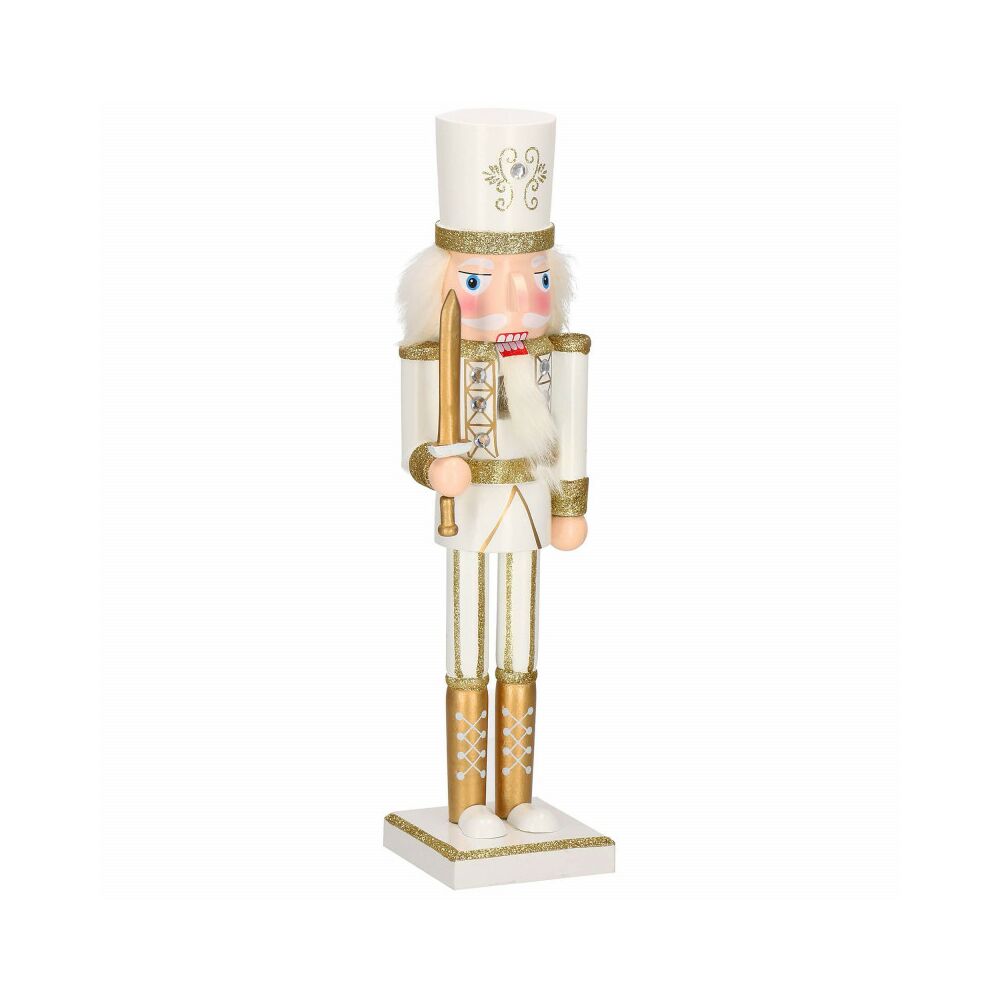 Louskáček je vyroben z ručně malovaného dřeva a propracován do posledního detailu. Zdobí ho zirkony, vysoká čepice, měč a dlouhé vousy. Zatažením za vousy nebo stisknutím páčky na zádech otevírá a zavírá ústa.