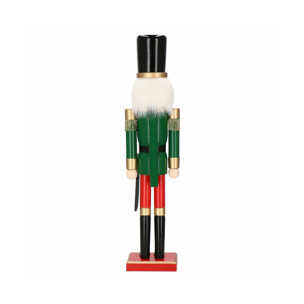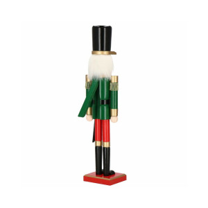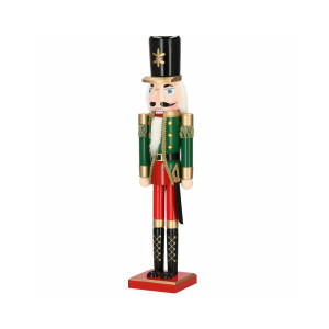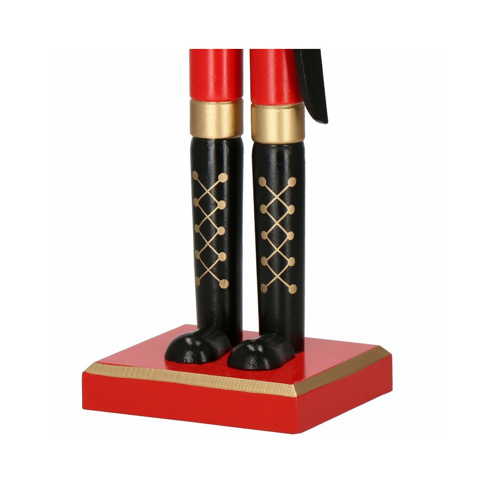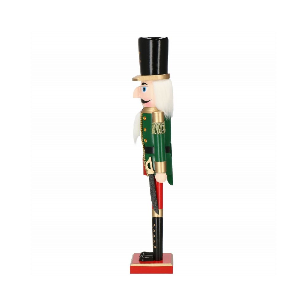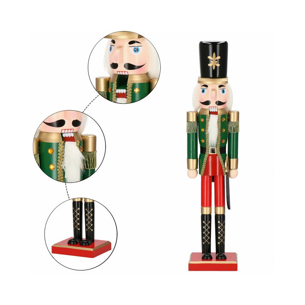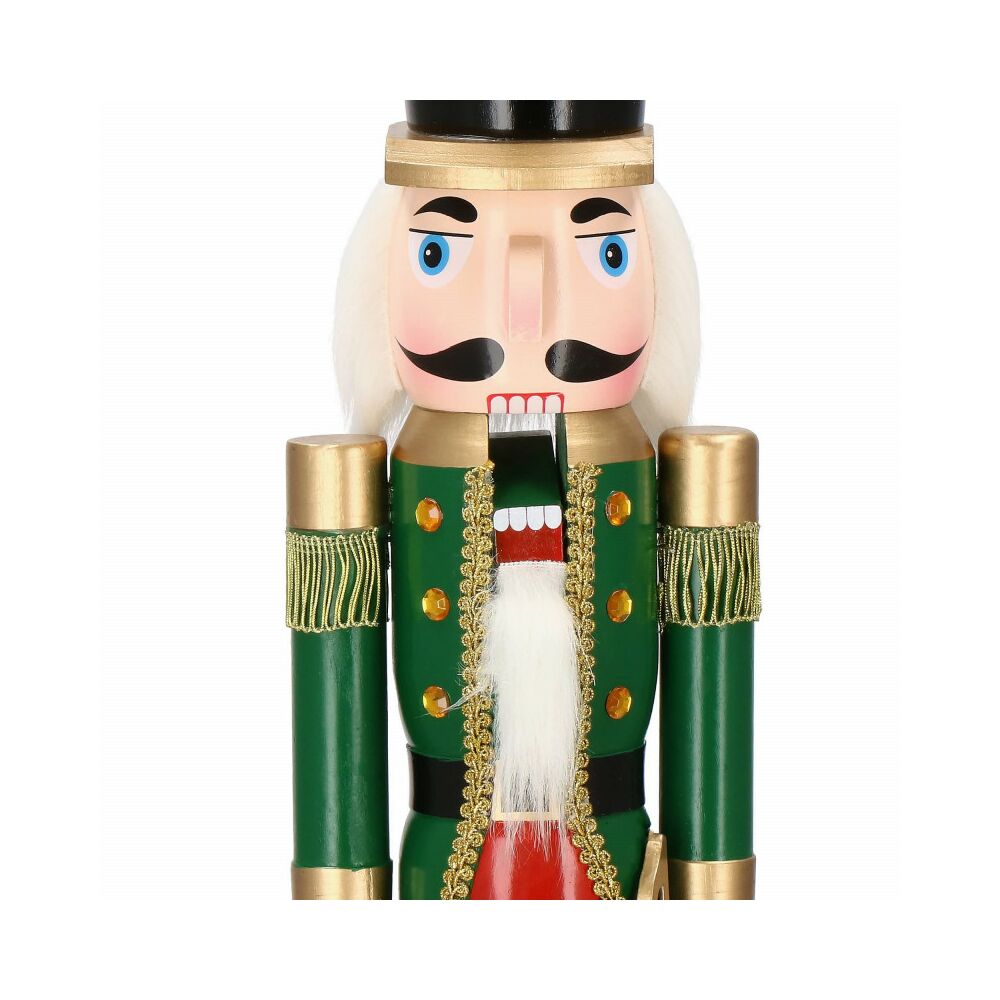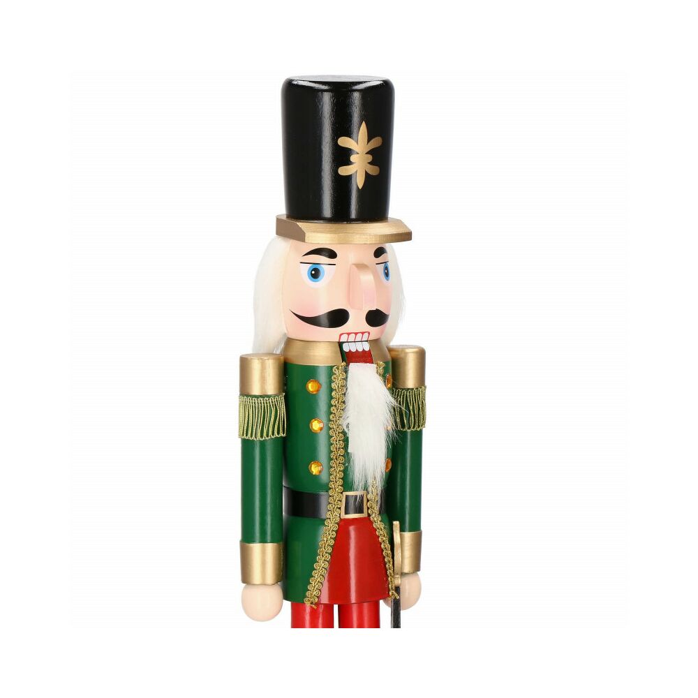 Louskáček je vyroben z ručně malovaného dřeva a propracován do posledního detailu. Zdobí ho zirkony, vysoký klobouk, šavle a dlouhé vousy. Zatažením za vousy nebo stisknutím páčky na zádech otevírá a zavírá ústa.