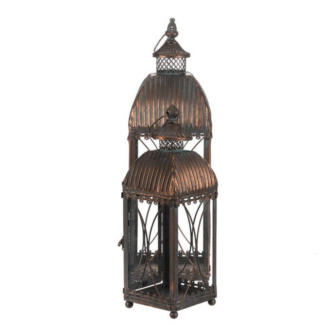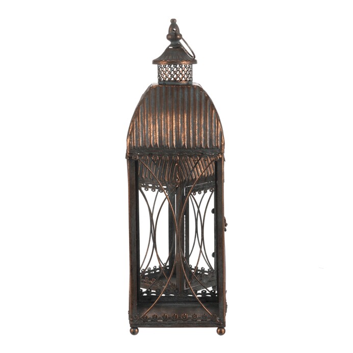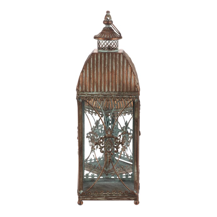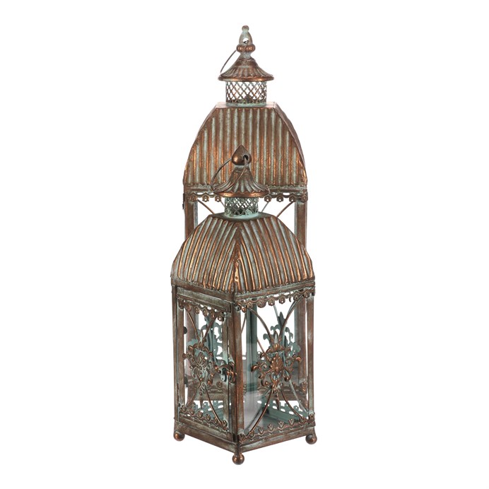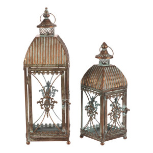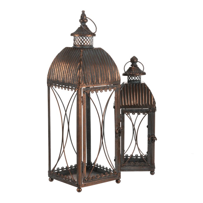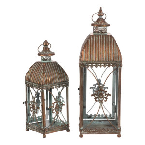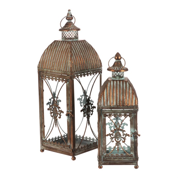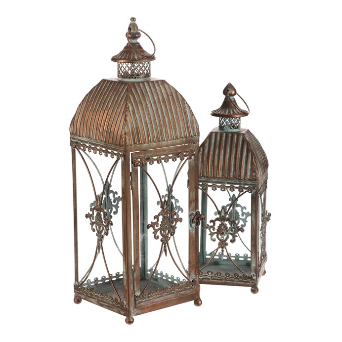Dotaz na produkt Na splátky ještě dnesSada dvou kovových luceren ve čtyřbokém provedení s ozdobnými ornamenty a měděnou patinou dodá vašemu domovu či zahradě kouzlo starých časů. Lze je postavit i zavěsit, skvěle se hodí pro sváteční dekorace i celoroční výzdobu.