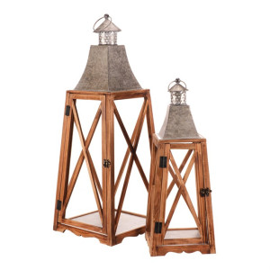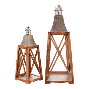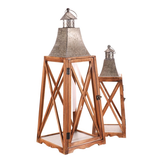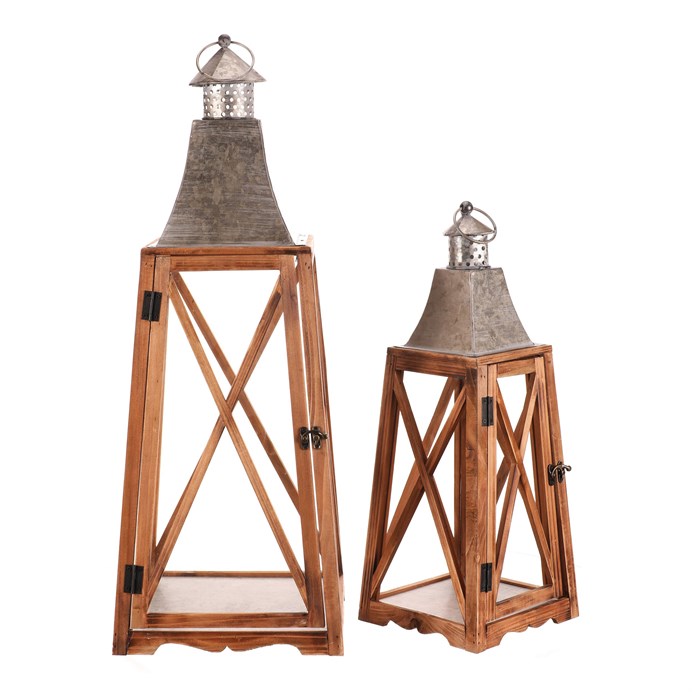 Dotaz na produkt Na splátky ještě dnesTato čtyřboká dřevěná lucerna ve tvaru jehlanu je k dispozici v sadě dvou velikostí, které dodají vašemu prostoru příjemné světlo a stylový nádech. Rámy v přírodní barvě dřeva ladí s kovovým vrškem ve stříbrném odstínu, což lucernám přidává elegantní kontrast. Díky kroužku na vrcholu je snadno zavěsíte a přenesete tam, kam je třeba.
