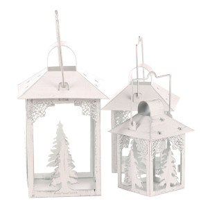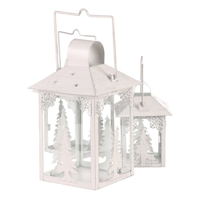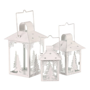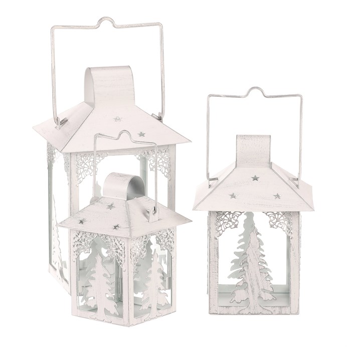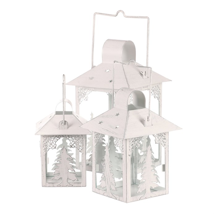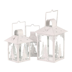 Dotaz na produkt Na splátky ještě dnesNavoďte si atmosféru plné romantiky a pohody s naší sadou kovových čtyřbokých luceren v bílých barvách. Sestávají se ze tří různých velikostí, každá s čirým sklem ze všech stran, a navíc jsou zdobené siluetami jehličnatých stromků. Dvířka na jedné straně umožňují snadný přístup k vložení svíčky. Každá lucerna je shora vybavena poutkem, který umožňuje její bezpečné zavěšení. Lze ji i postavit, a to na libovolné místo, jako jsou terasy, altánky, pergoly a další viditelné pozice. Už jen vyčkat, až přijde soumrak, a můžete si vychutnat nádherný světelný efekt, který vytvoří plápolající plamínek svíčky uvnitř.