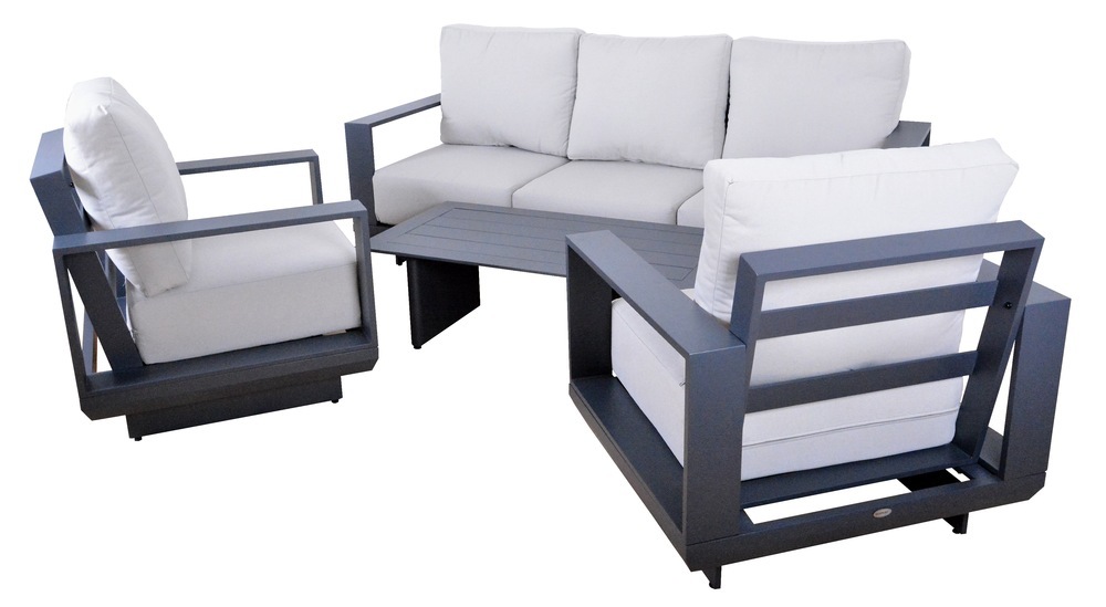 Luxusní hliníková souprava v grafitovém provedení. Moderní souprava, která skvěle zapadne do každého exteriéru či interiéru. Velmi pohodlné podušky z polyesteru (250g/m2) s molitanovou výplní (20 cm) jsou odolné UV záření. Všechny podušky jsou vybaveny zipy, díky kterým můžete polyesterový potah z vodoodpudivé předené tkaniny jednoduše sundat. Souprava má díky použitým materiálům a modernímu vzhledu opravdu široké využití, je vhodná pro vnitřní i venkovní prostory - zahrady, terasy, zimní zahrady nebo třeba do uvítací haly či recepce. Díky jednoduché montáži, budete moci již po chvíli soupravu naplno využít.