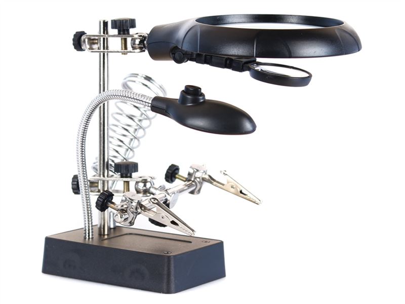 držák nástrojů, ruční svěrky, držák pájky a stolní lampu.