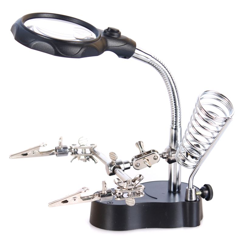 Dvě lupy v jedné stabilní základně s flexibilním krkem Navíc speciální svěrky, držák pro pájku a LED diody Jedna pevná čočka s přiblížením 3,5 x a průměrem 65 mm Jedna menší čočka s přiblížením 12 x a průměrem 17 mm Je k dispozici 2 x LED osvětlení zabudované do okraje lupy Napájení z baterií 3 x AAA umístěných v základně