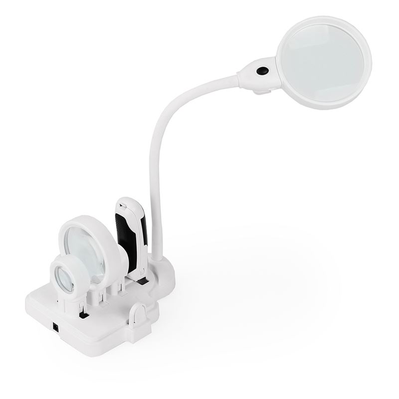 Kombinace: tři ruční / stolní lupy, praktický držák nástrojů a lampa