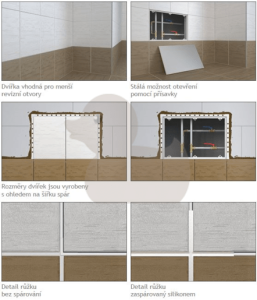 Výhody: žádné přerušení dekoru, dvířka nemusíme spárovat - PVC rámeček spáru nahradí, rámeček můžeme použít na všechny tloušťky obkladů, dvířka lze přísavkou snadno otevřít, velmi jednoduché a rychlé zabudování