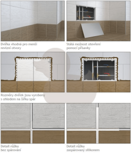 Výhody: žádné přerušení dekoru, dvířka nemusíme spárovat - PVC rámeček spáru nahradí, rámeček můžeme použít na všechny tloušťky obkladů, dvířka lze přísavkou snadno otevřít, velmi jednoduché a rychlé zabudování