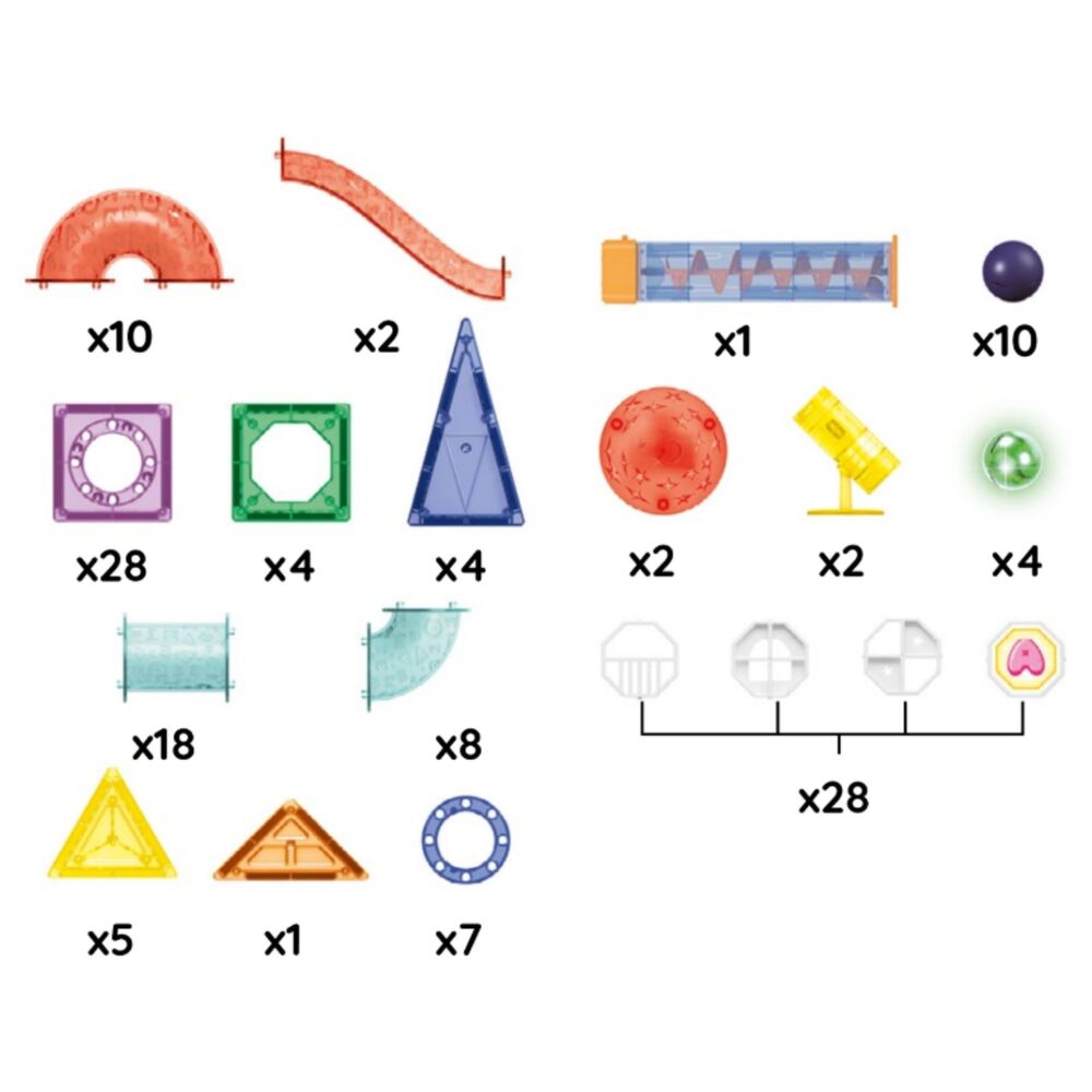 Každý dílek je navržen pro snadné a bezpečné spojování pomocí magnetů, což dětem umožňuje rychle stavět i rozebírat své výtvory. Součástí balení jsou reflektory pro dodatečné osvětlení, které zvýrazní průhlednost a barevnost celé dráhy. Díky odolnému provedení vydrží stavebnice dlouhodobé používání a stane se oblíbenou hračkou dětí od 3 let, které s ní zažijí hodiny zábavy i poučení.