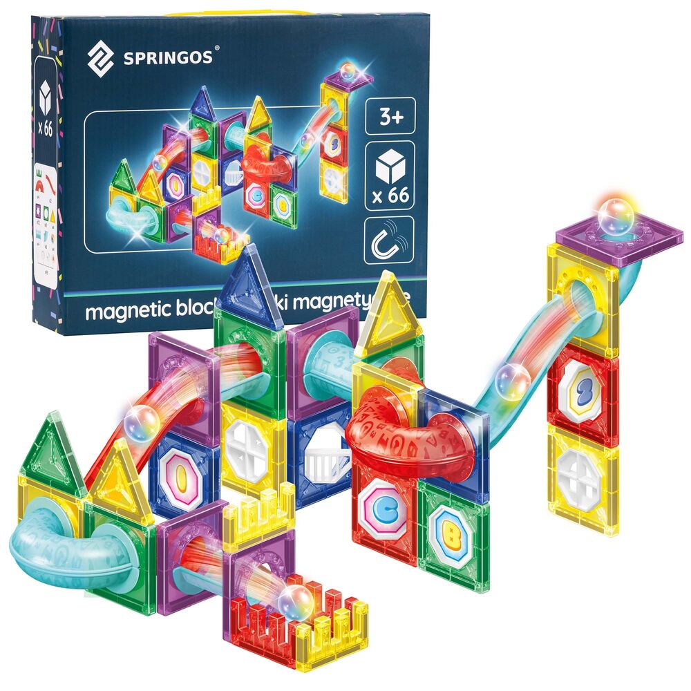 Magnetická stavebnice 66 dílů SPRINGOS KG0063 je barevná a kreativní hračka, která dětem nabízí nekonečné možnosti stavění. Díky průhledným magnetickým blokům různých velikostí mohou vytvářet nejrůznější konstrukce, věže, dráhy či tobogány. Součástí sady jsou také svítící LED kuličky, které při pohybu po dráze vytvářejí působivý světelný efekt. Stavebnice podporuje rozvoj kreativity, logického myšlení a jemné motoriky, a zároveň přináší zábavu plnou fantazie a objevování.