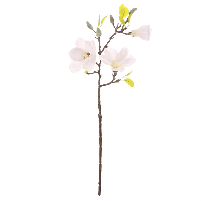 Dotaz na produktUmělá magnolie v bílé barvě představuje dekorativní větev s jemně tvarovanými květy a listy z textilu, které věrně napodobují přírodní vzhled. Větev je detailně zpracovaná s realistickou strukturou stonku a pupenů, což přispívá k autentickému vizuálnímu efektu. Díky svému provedení je vhodná pro aranžmá v interiérech, kde přináší svěží a elegantní atmosféru bez nutnosti péče. Hodí se do vázy samostatně i v kombinaci s dalšími květinami či dekoracemi.
