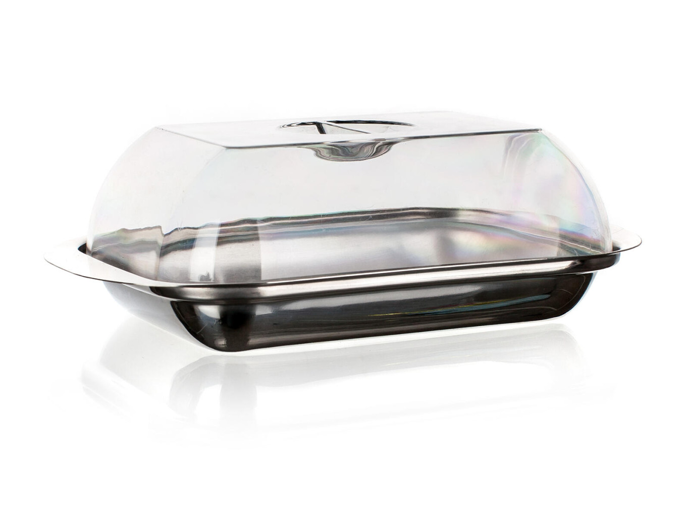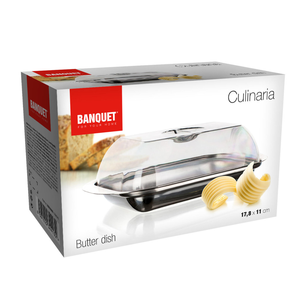 Dotaz na produktDóza na máslo CULINARIA, rozměry dózy: délka 17,8 cm, šířka 11 cm, výška 5,5 cm, materiál - nerez 430 (18 / 0, síla 0,50 mm), plastové transparentní víčko.