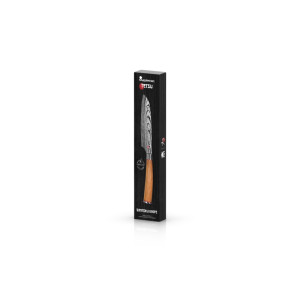 Tento nůž Santoku je ideální pro jemné krájení, sekání bylinek a zeleniny a perfektně doplní každou kuchyni s důrazem na eleganci a funkčnost.