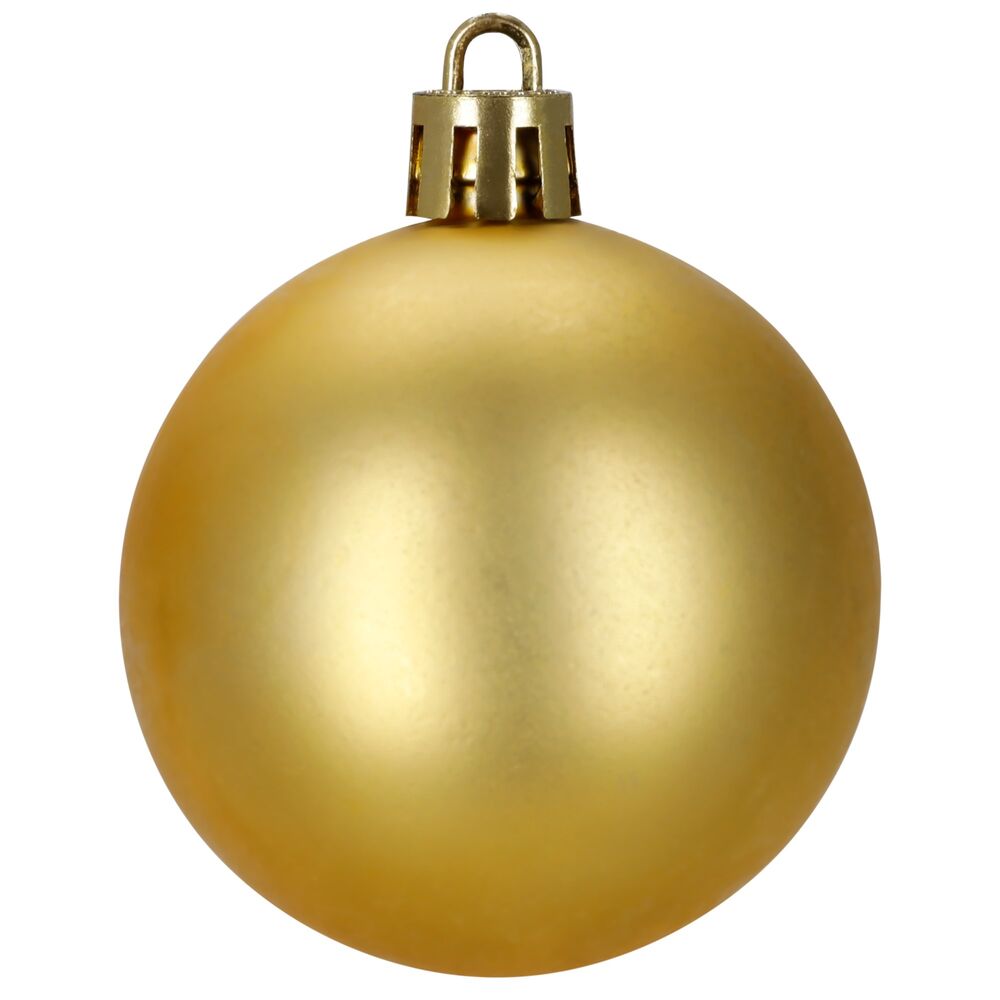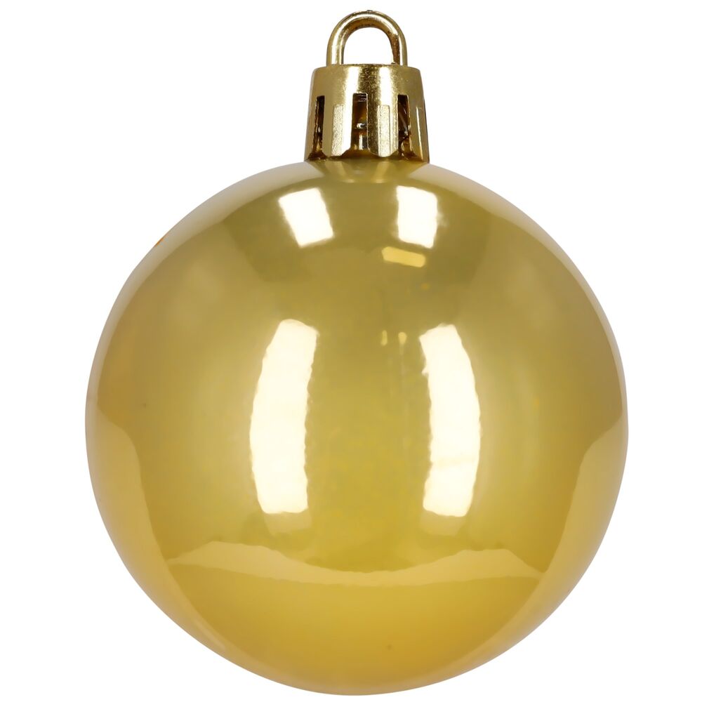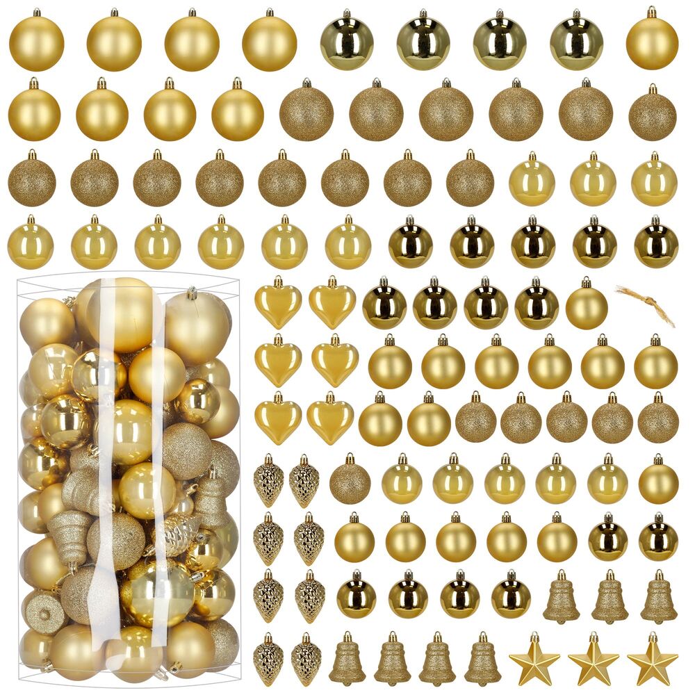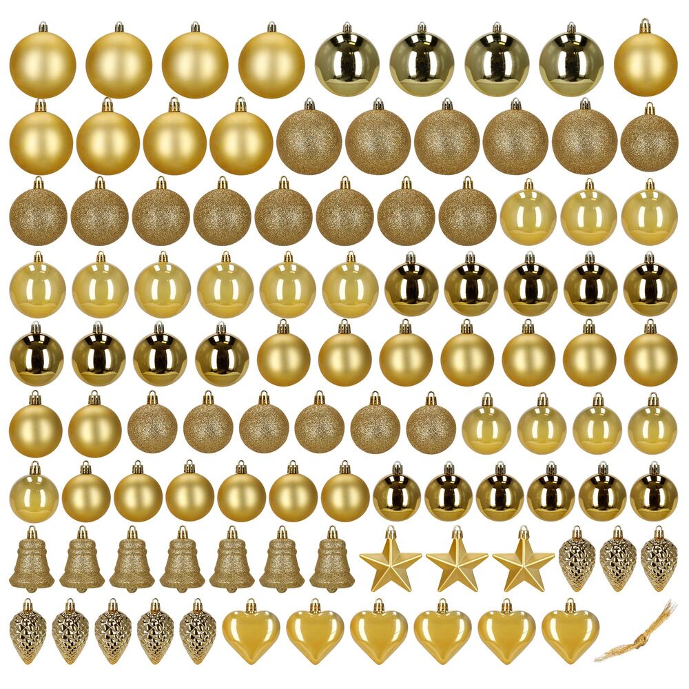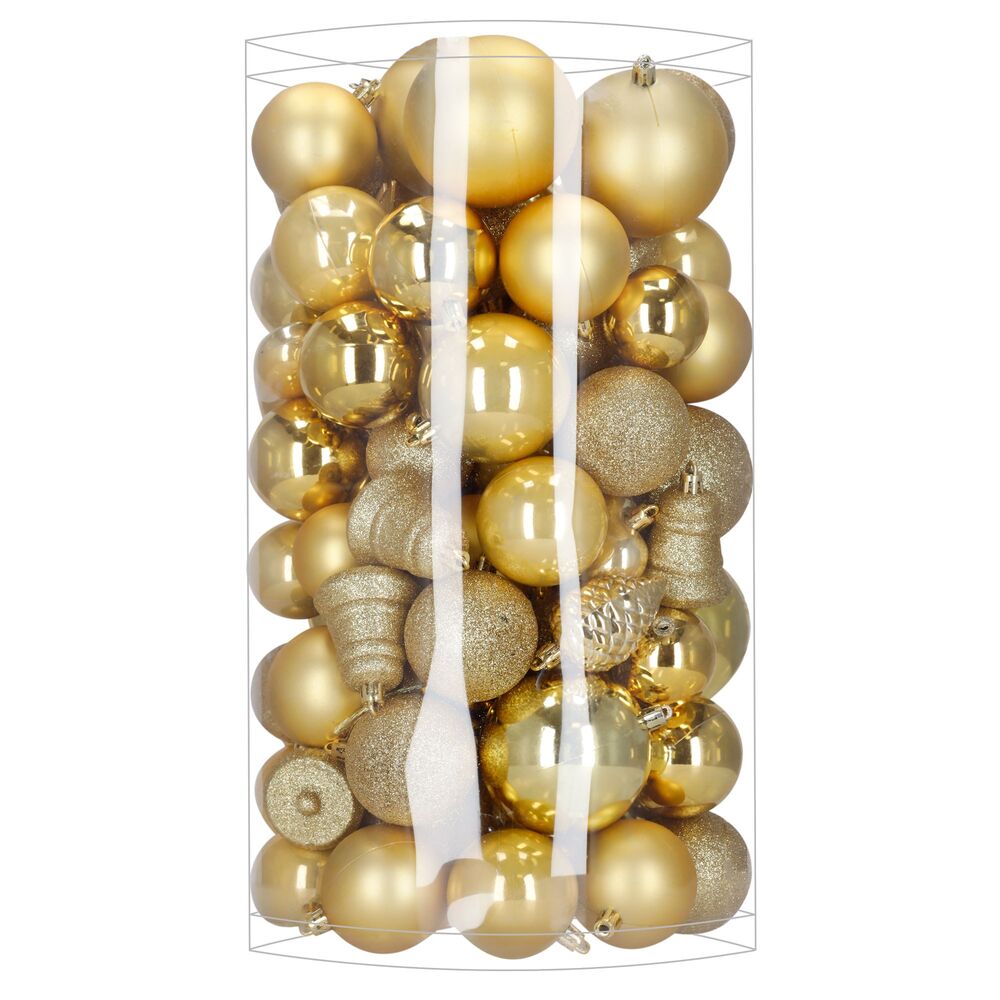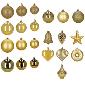 Velká sada zlatých vánočních ozdob v různých velikostech a povrchových úpravách dodá výzdobě luxusní, slavnostní a elegantní vzhled. Obsahuje lehké, nerozbitné plastové koule i tematické dekorace s poutky pro snadné zavěšení. Ideální na stromeček i jako dekorace v interiéru či exteriéru. Průměry koulí: 4,5 cm, 5,5 cm, 6 cm a 7,5 cm.
