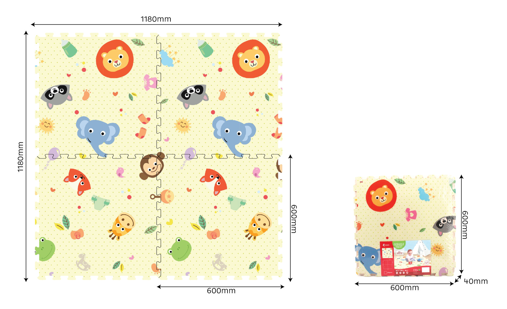 Dotaz na produktMěkké bloky, 4 ks, motiv zvířátka. Rozměry 60 x 60 cm. Tloušťka 1 cm.