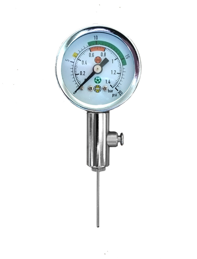 Kovový měřič tlaku míčů s vypouštěcím ventilem Sedco je kvalitní a přesný měřič tlaku míčů. Pod budíkem je tlačítko pro vypouštění přehuštěných míčů.