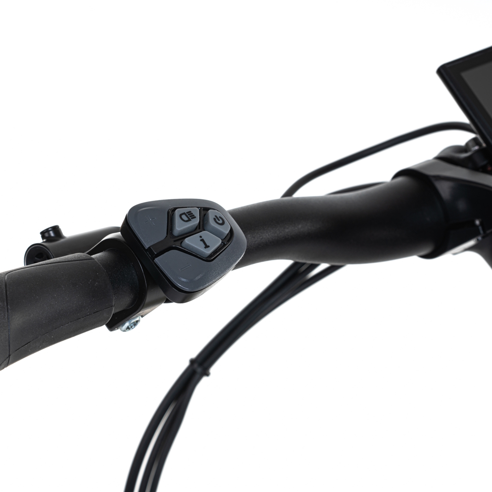 Elektrokolo Urban MX 468 nabízí širokou škálu praktických doplňků. Na nastavitelných řídítkách najdete zvonek a uzamykatelné gripy, které zabraňují prokluzování. Kromě toho je elektrokolo vybaveno krytem řetězu. Před blátem Vás ochrání i gumové prodloužení blatníků.