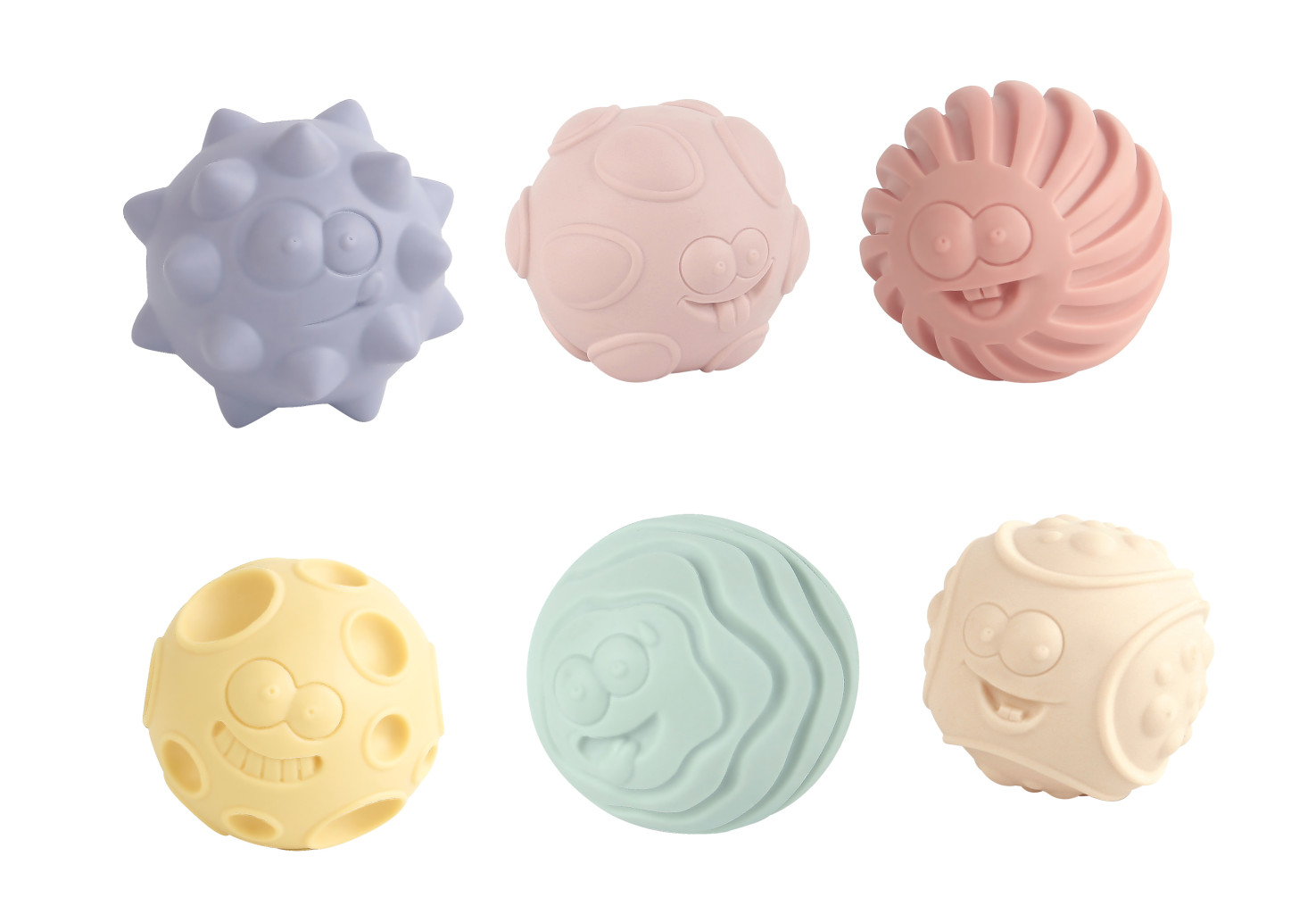 Dotaz na produktMíčky motorické. Velikost 6cm. Obsahuje 6ks měkkých míčků s různými povrchy. Při zmáčknutí píská.