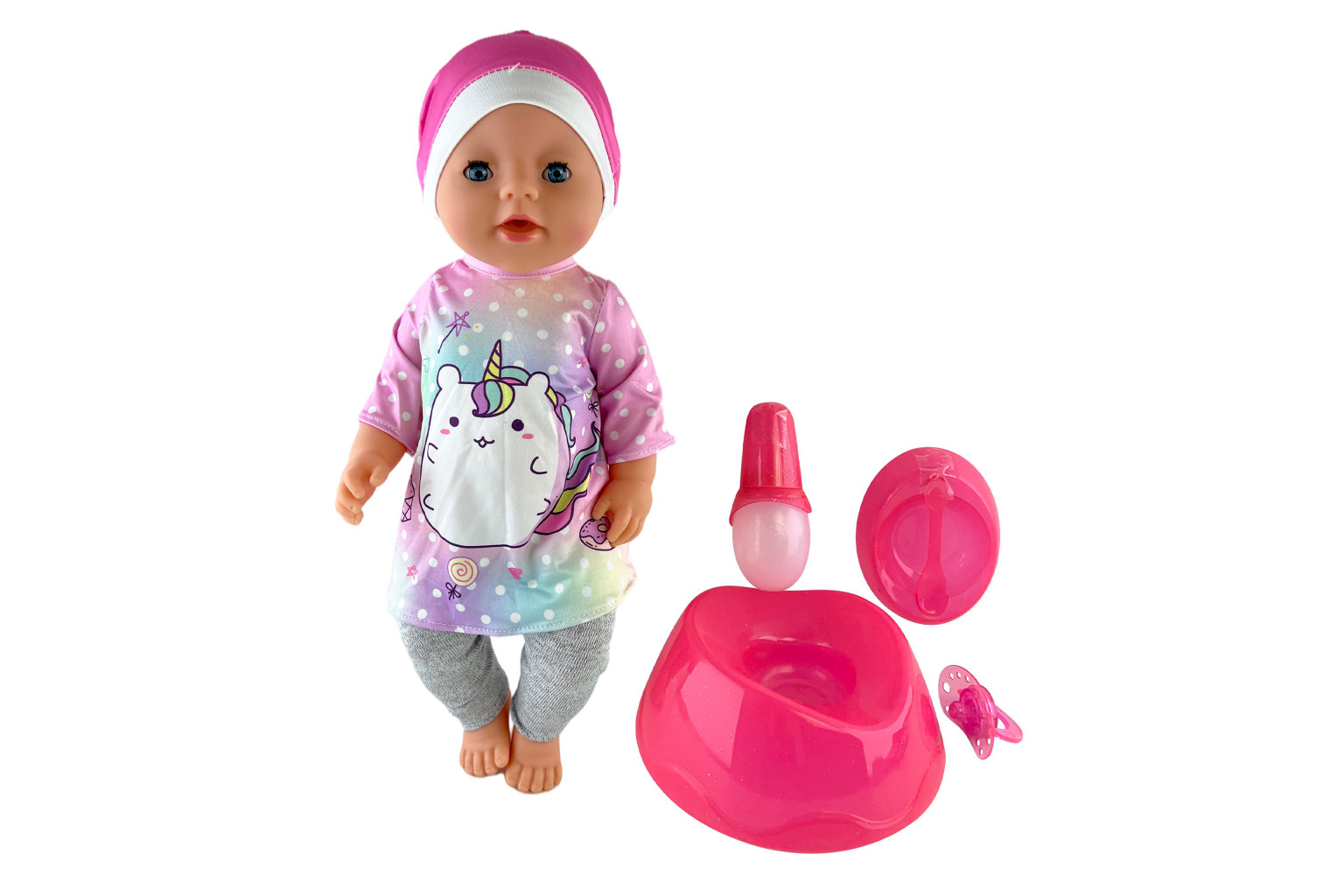 Dotaz na produktMiminko čurající s příslušenstvím. Velikost 45 cm. Příslušenství: nočník, miska s lžičkou, lahvička na krmení, plenka, krabička s překvapením, dudlík, průkaz. Miminko se nakrmí vodou pomocí lahvičky. Po zmáčknutí ruky mu tečou slzy. Po stlačení pupíku čurá. Při položení na záda zavře oči.
