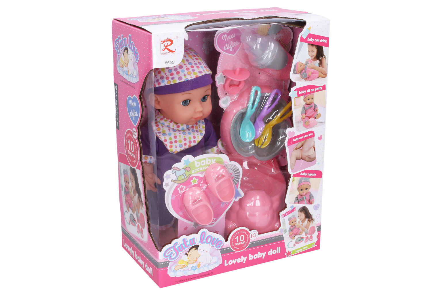 Dotaz na produktMiminko čurající. Velikost 30cm. Miminko pije z lahvičky, čurá, zavírá oči při položení na záda. Obsahuje panenku, nočník, talířek, příbor, lahvičku, dudlík. Vydává zvuky. 3xAG13 baterie součástí balení.