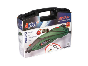 Mini přímá bruska značky ASIST s příkonem 135 Wattů váží pouze 600 gramů. Má plynulou regulací otáček v rozmezí 8000 až 33000 otáček za minutu. Dodává se s 41 díly příslušenství. Ideální na jemné opracování materiálů.