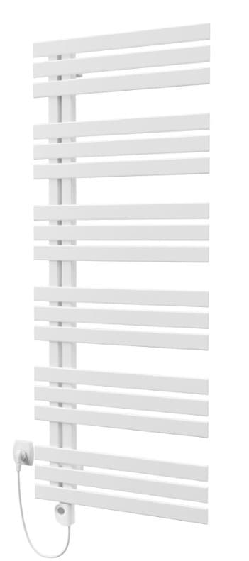 Dotaz na produkt Na splátky ještě dnesElektrický designový radiátor v bílé barvě s topnou tyčí MINI vlevo.