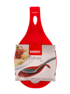 Dotaz na produktSilikonová odkládací miska CULINARIA red, rozměry: délka 23 cm, šířka 11,5 cm, výška 2,5 cm. Praktická pomůcka na odkládání vařeček, příborů a jiného náčiní při vaření. Silikon je velmi populární materiál, který pro své jedinečné vlastnosti našel své uplatnění i v kuchyni. Vyrábí se z něj různé druhy forem na pečení, vály a válečky na těsto, stěrky, mašlovačky, různé druhy kuchyňské náčiní a mnohé další výrobky.