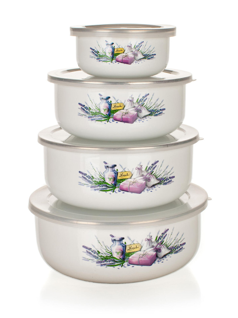 Sada smaltovaných misek s plastovými víky LAVENDER.