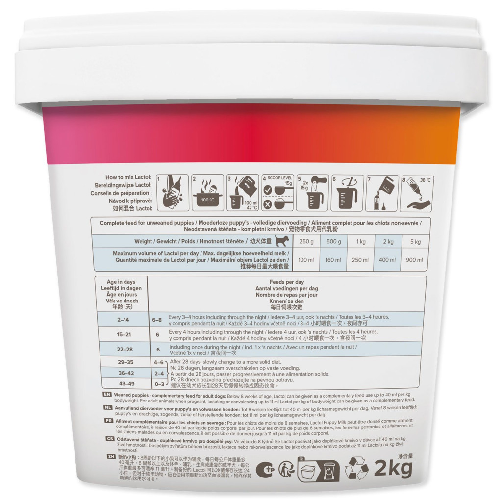 Návod k použití: Přidejte Lactol Puppy Milk do teplé (ne vařící) vody a míchejte, dokud se zcela nerozpustí. Nechte mléko vychladnout do 38 °C nebo tělesné teplota.