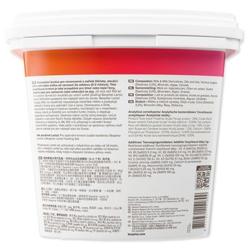 Analytické složky: hrubý protein 24 %, hrubé oleje a tuky 24 %, hrubý popel 7 %, vlhkost 3,5 %, vápník 0,8 %, fosfor 0,7 %, sodík 0,5 %, hořčík 0,16 %, draslík 1,5 %, dokosahexaenová kyselina (DHA) 0,1 %, laktóza 42 %, omega-3 mastné kyseliny 0,1 %