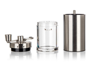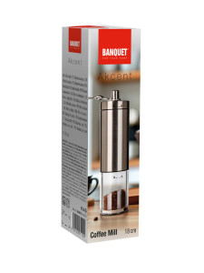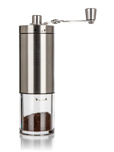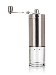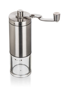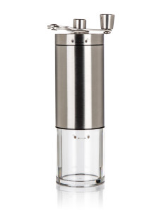 Mechanický mlýnek na kávu AKCENT je dodáván v nerezovém provedení s plastovým průhledným zásobníkem.