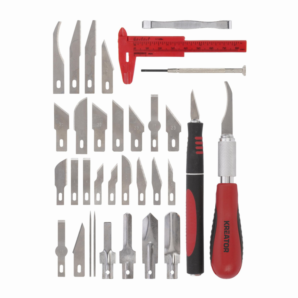 Dotaz na produktTato sada modelářských nožíků KRTH23202 z naší řady Kreator je ideální pro detailní práci. Kromě 30dílných čepelí obsahuje sada také 2 dlouhé rukojeti nožů s ergonomickou měkkou rukojetí a protiskluzovým povrchem, posuvné měřidlo, pinzetu a 1 přesný šroubovák. Tyto praktické modelářské nožíky mají několik využití, například pro modelářství nebo přesné řezání papíru a kartonu.